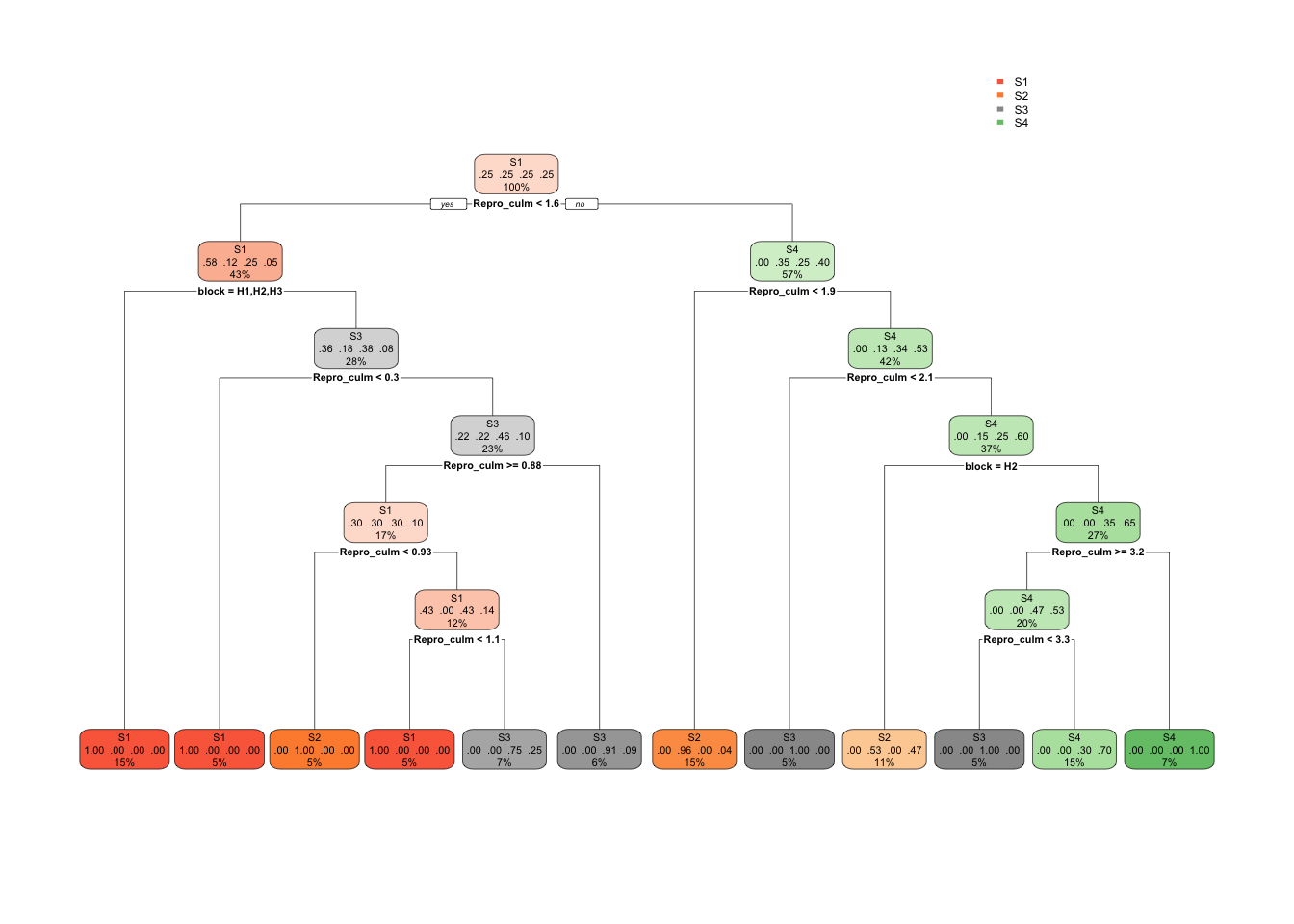 2) Repro_culm< 1.57725 77 32 S1 (0.58441558 0.11688312 0.24675325 0.05194805)